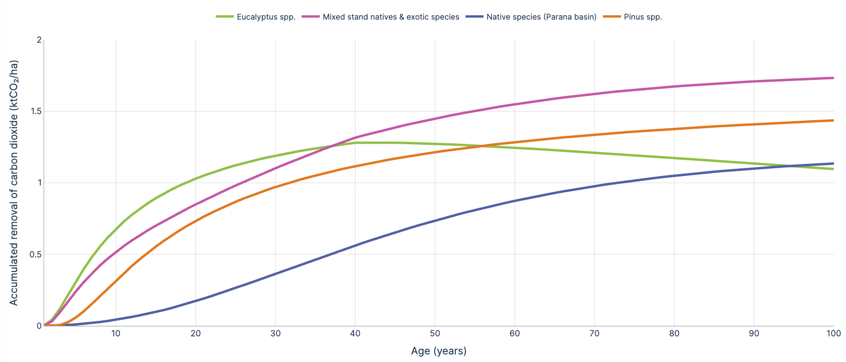 CO2 stock per hectare removed by different species or mix of species throughout 100 years